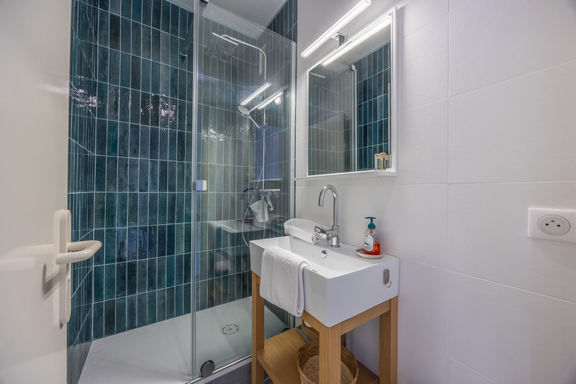 - une chambre avec un lit double (140 cm) et une salle de bain privative (douche),
