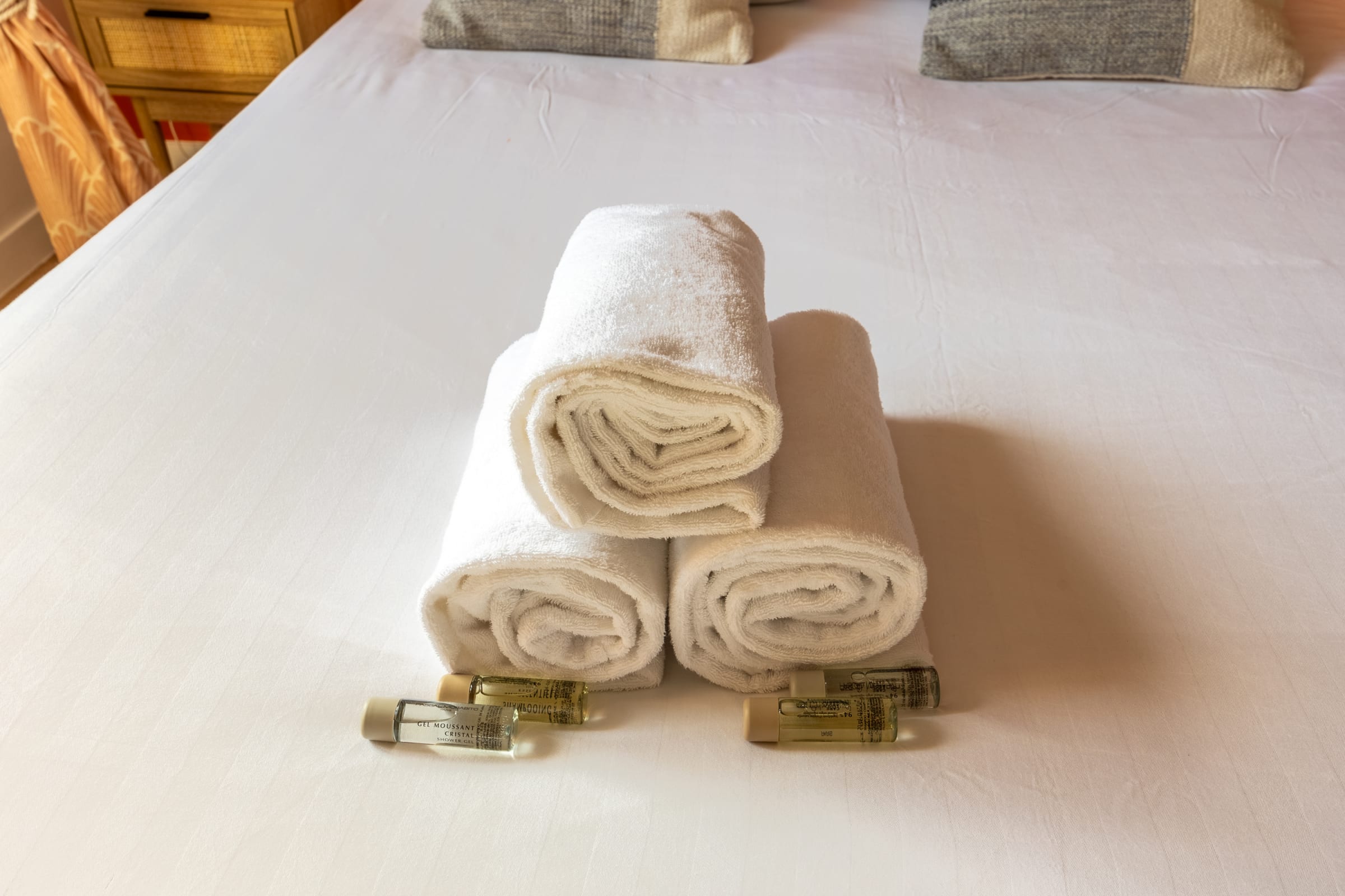 → Avant votre arrivée et après votre départ, notre équipe réalise un ménage de qualité hôtelière et met à votre disposition des serviettes de bain, du linge de lit de qualité hôtelière ainsi qu’une ligne de produits de soin naturels.