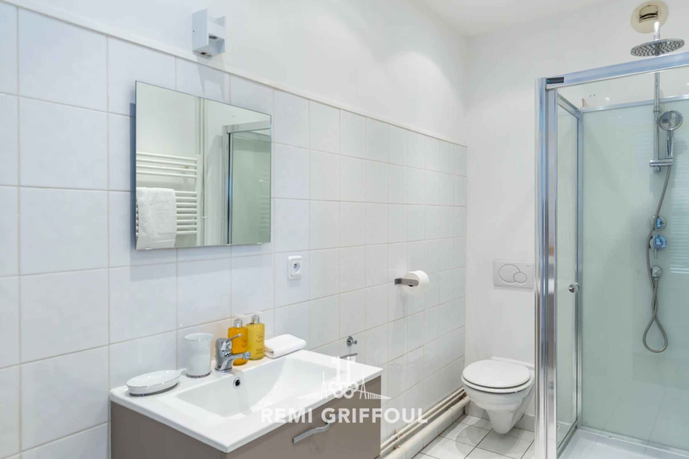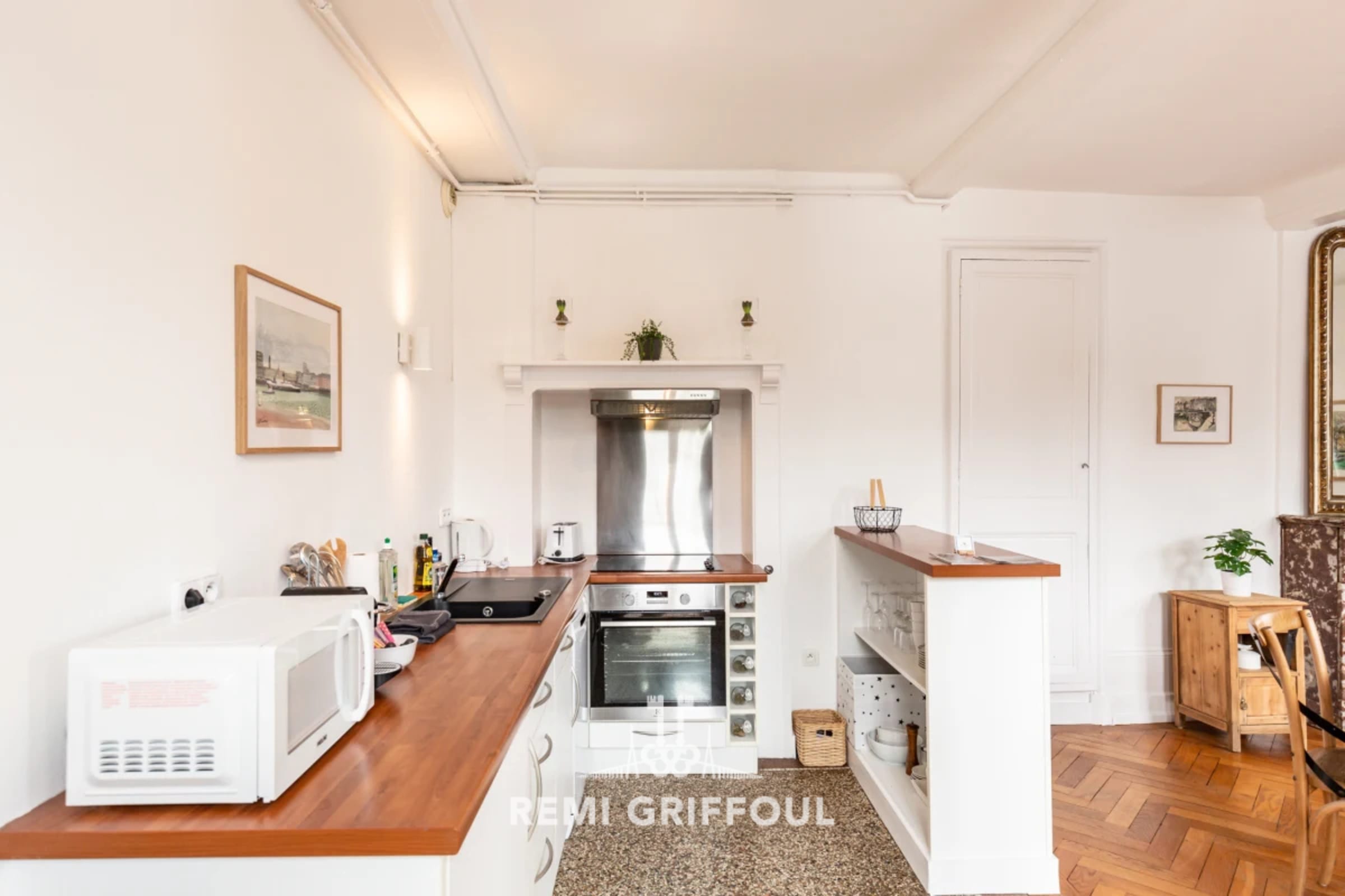 Il dispose d'une surprenante pièce de vie avec une belle hauteur sous plafond et un parquet ancien plein de charme , Vous y trouverez aussi la cuisine équipée avec (machine à café Nespresso, bouilloire, toaster, micro-onde, four, lave-vaisselle) .