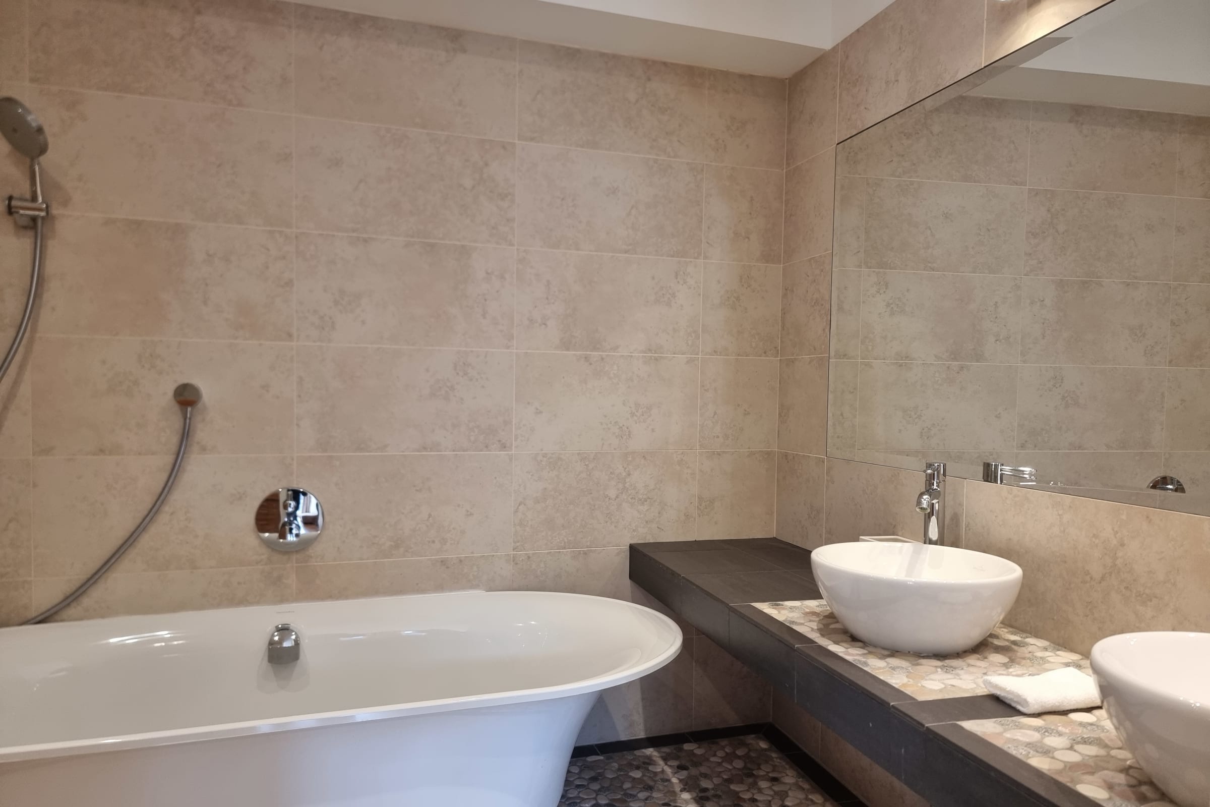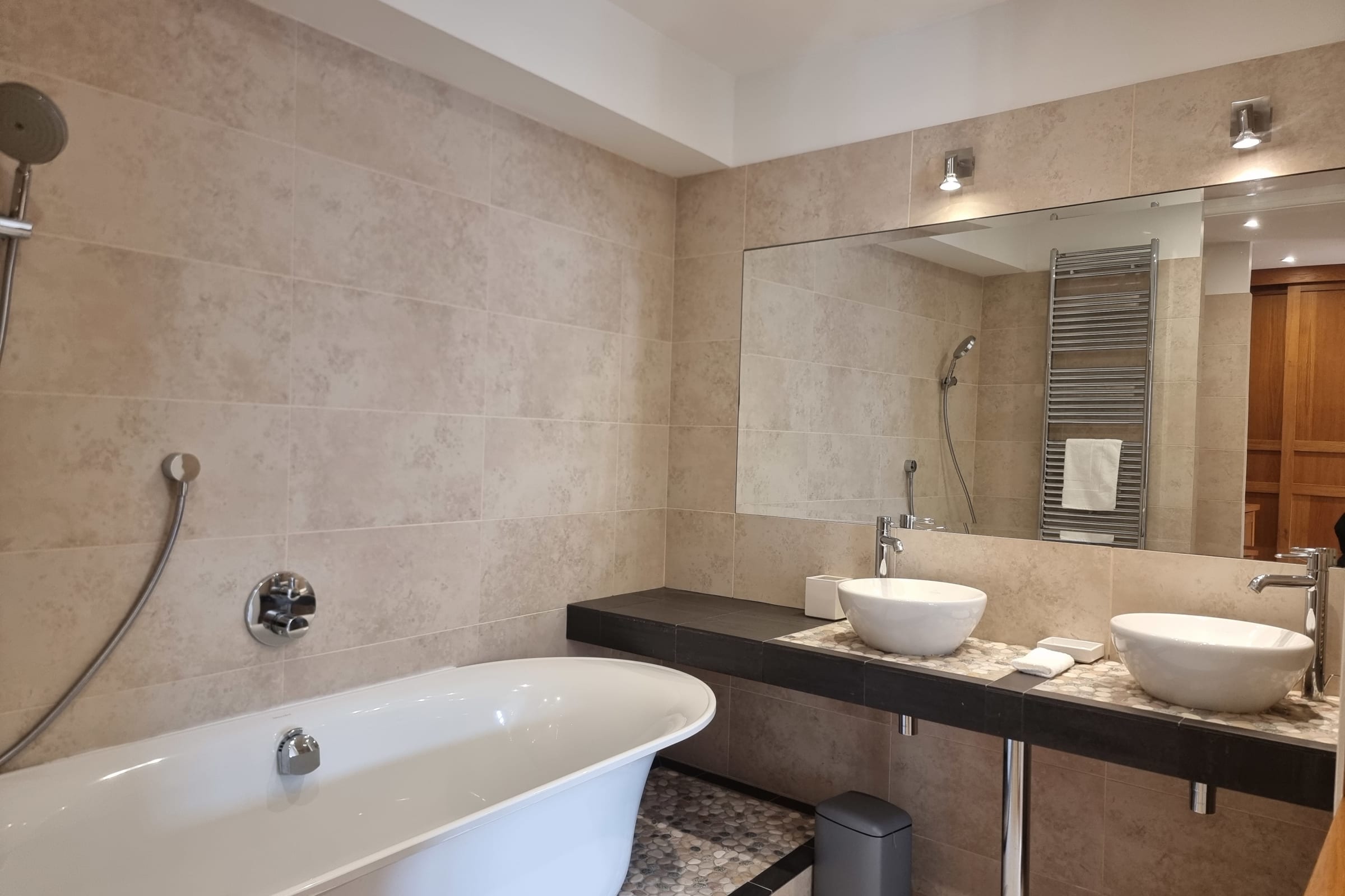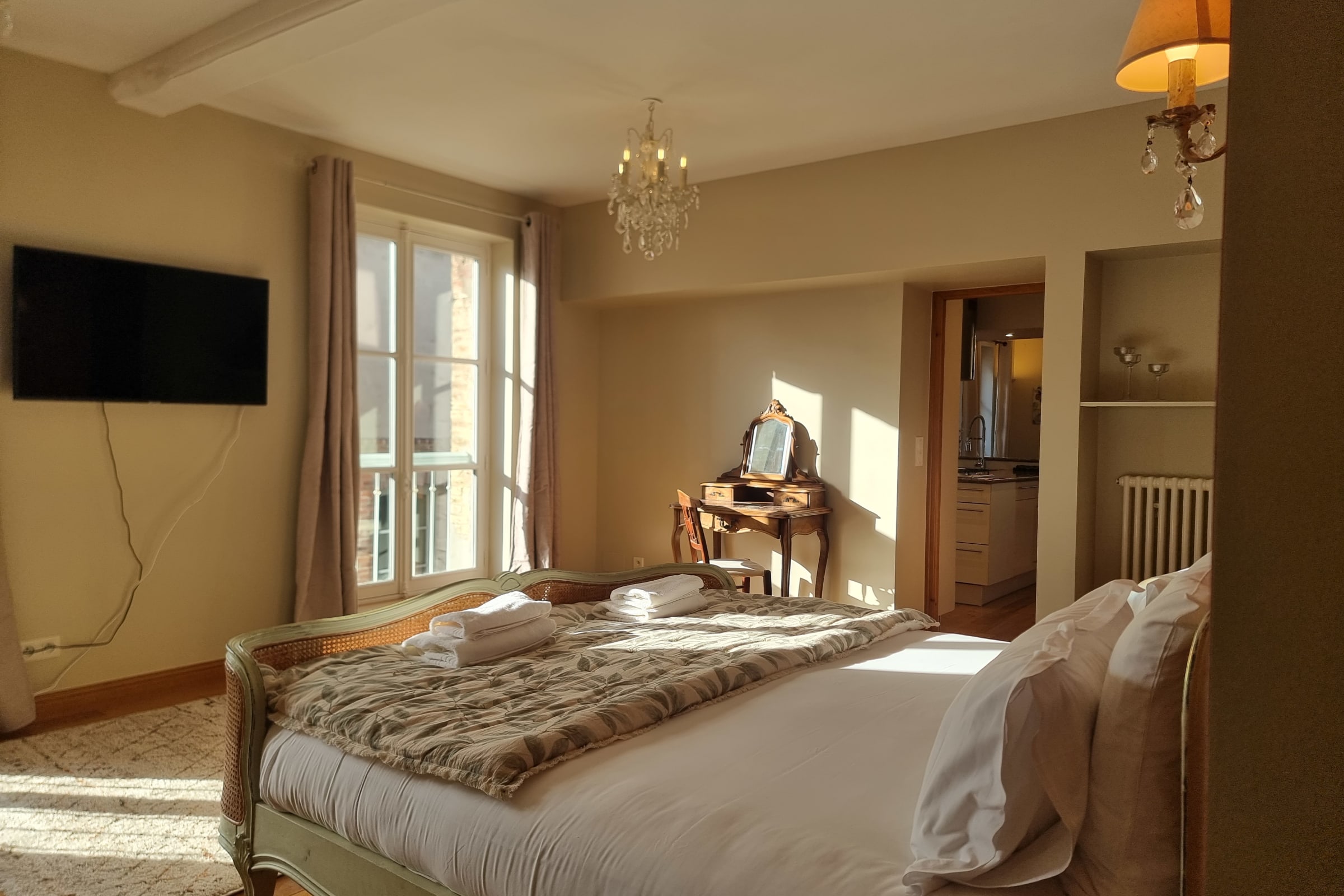 L’ambiance intérieure est chaleureuse, raffinée et harmonieuse. L’appartement dispose de deux chambres confortables. La chambre principale propose une literie douillette 180 x 200 cm et une TV pour des moments de détente. La seconde chambre bénéficie d’un lit très confortable 160 x 200 cm et d’une charmante vue. Chacune dispose de sa salle de bains attenante avec WC intégré. Un troisième WC invité est également à votre disposition.