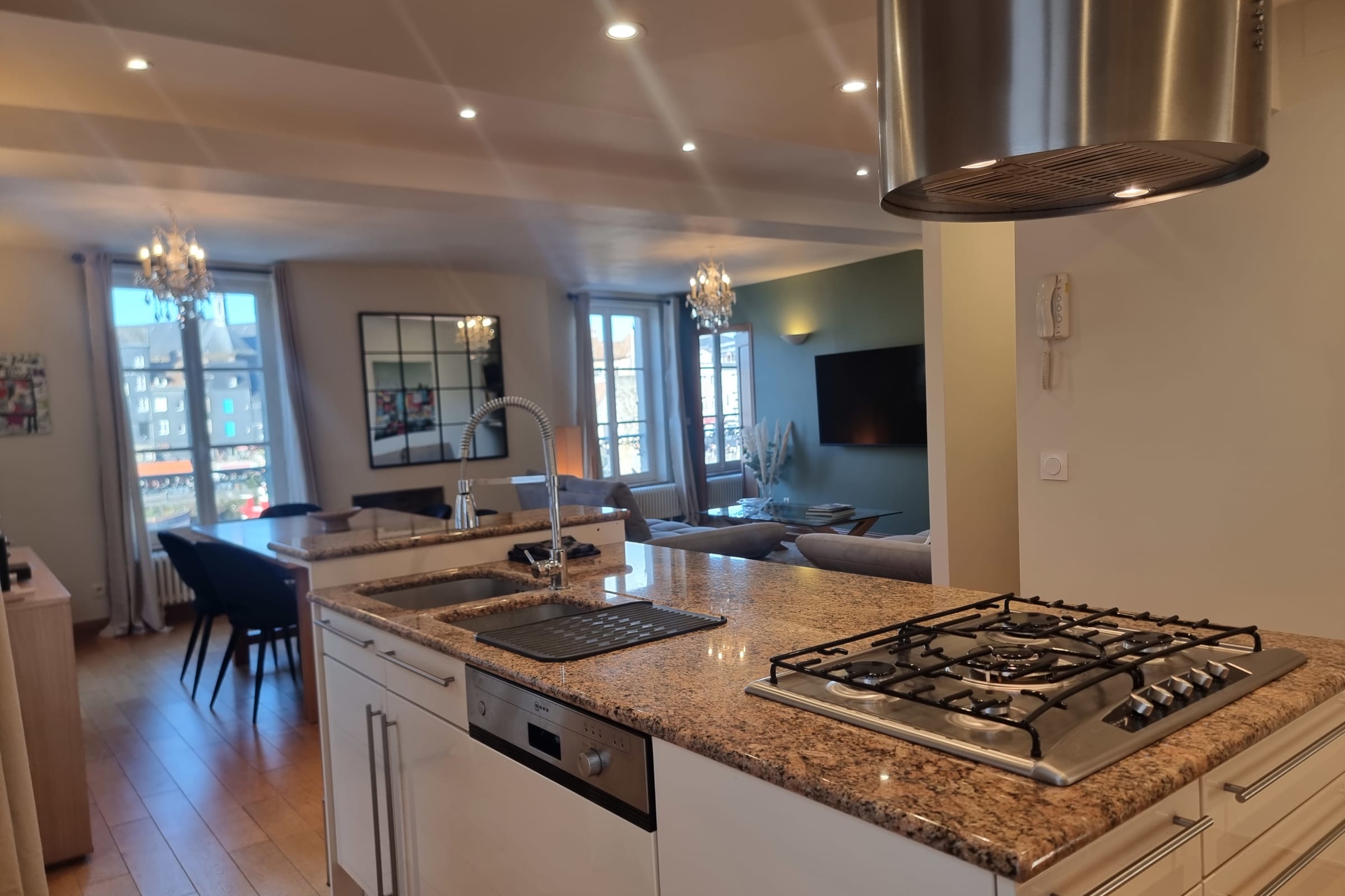 La cuisine moderne est entièrement équipée, parfaite pour préparer un petit déjeuner ou un dîner avec vue. Le salon est baigné de lumière. Le confort est complet avec un lave linge séchant et une connexion internet incluse.