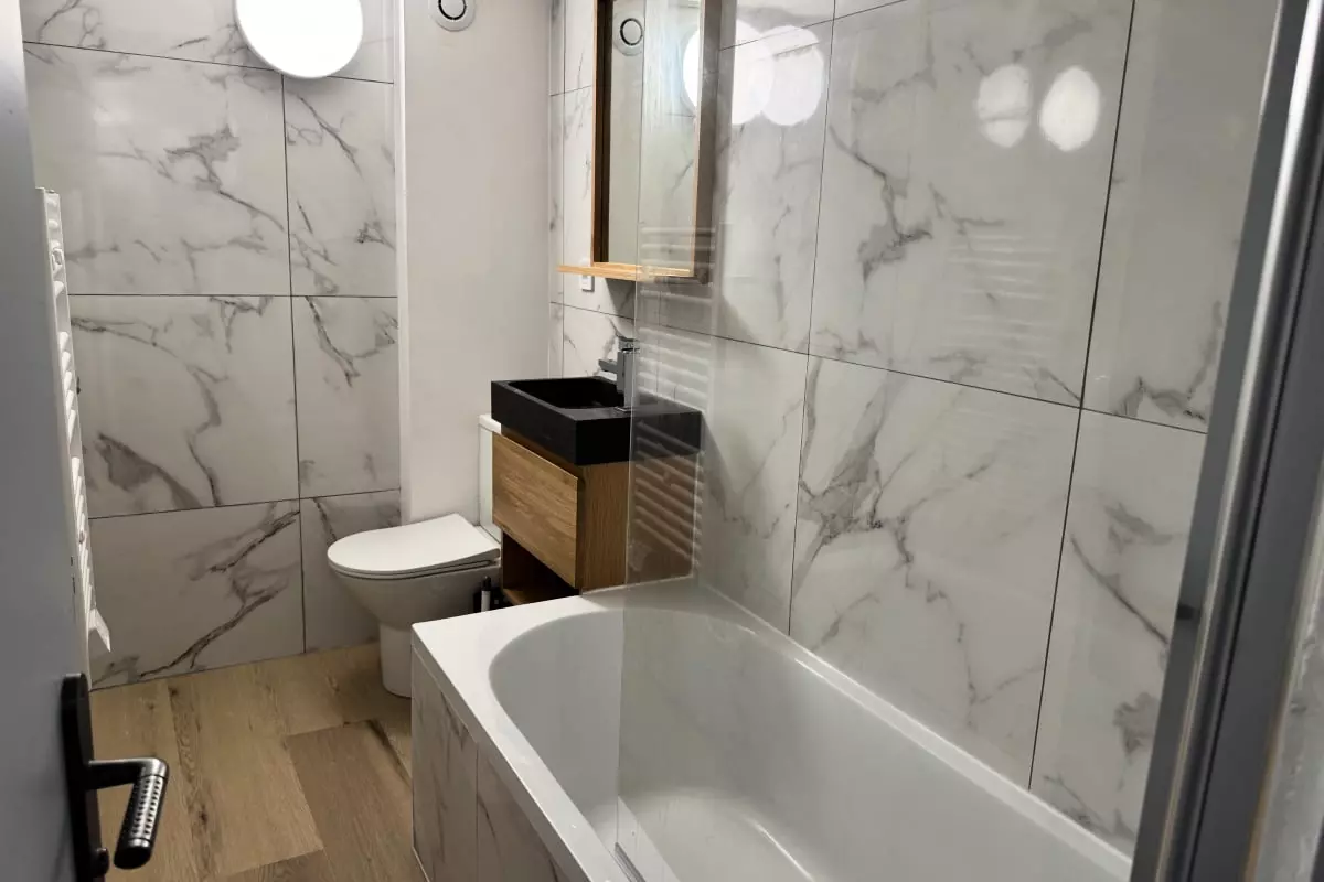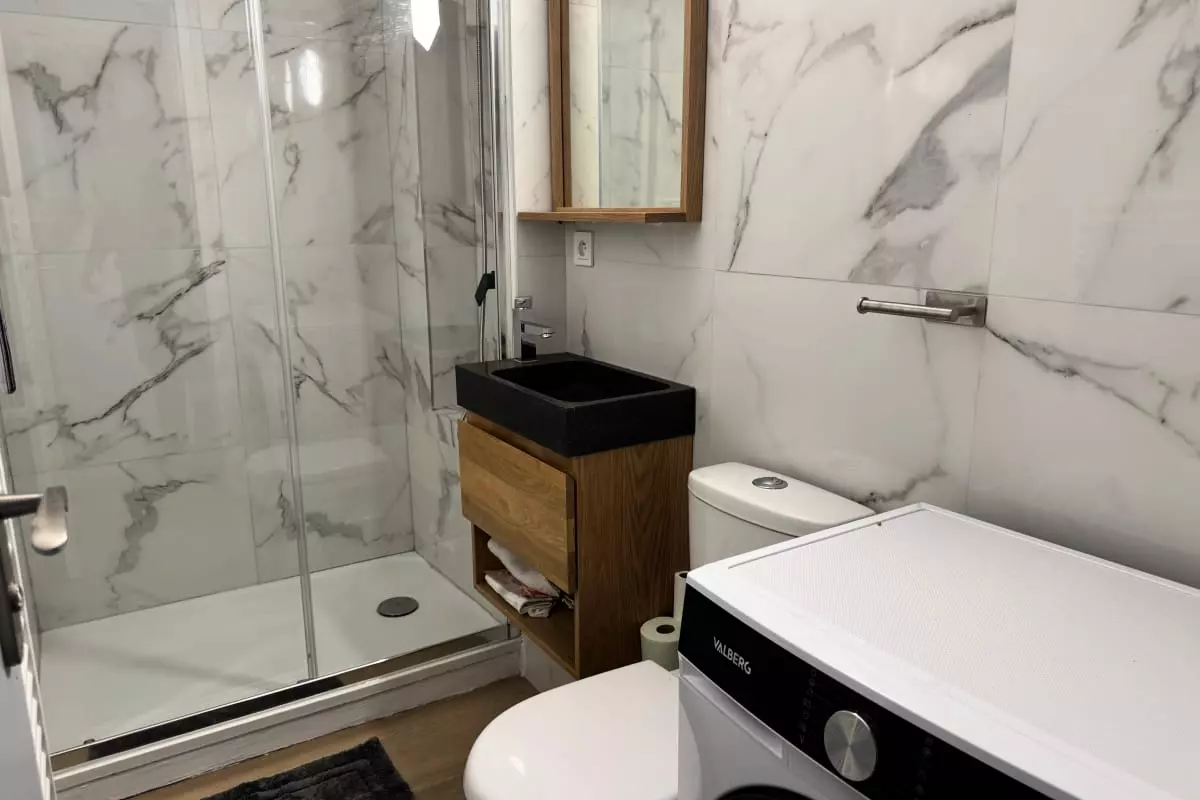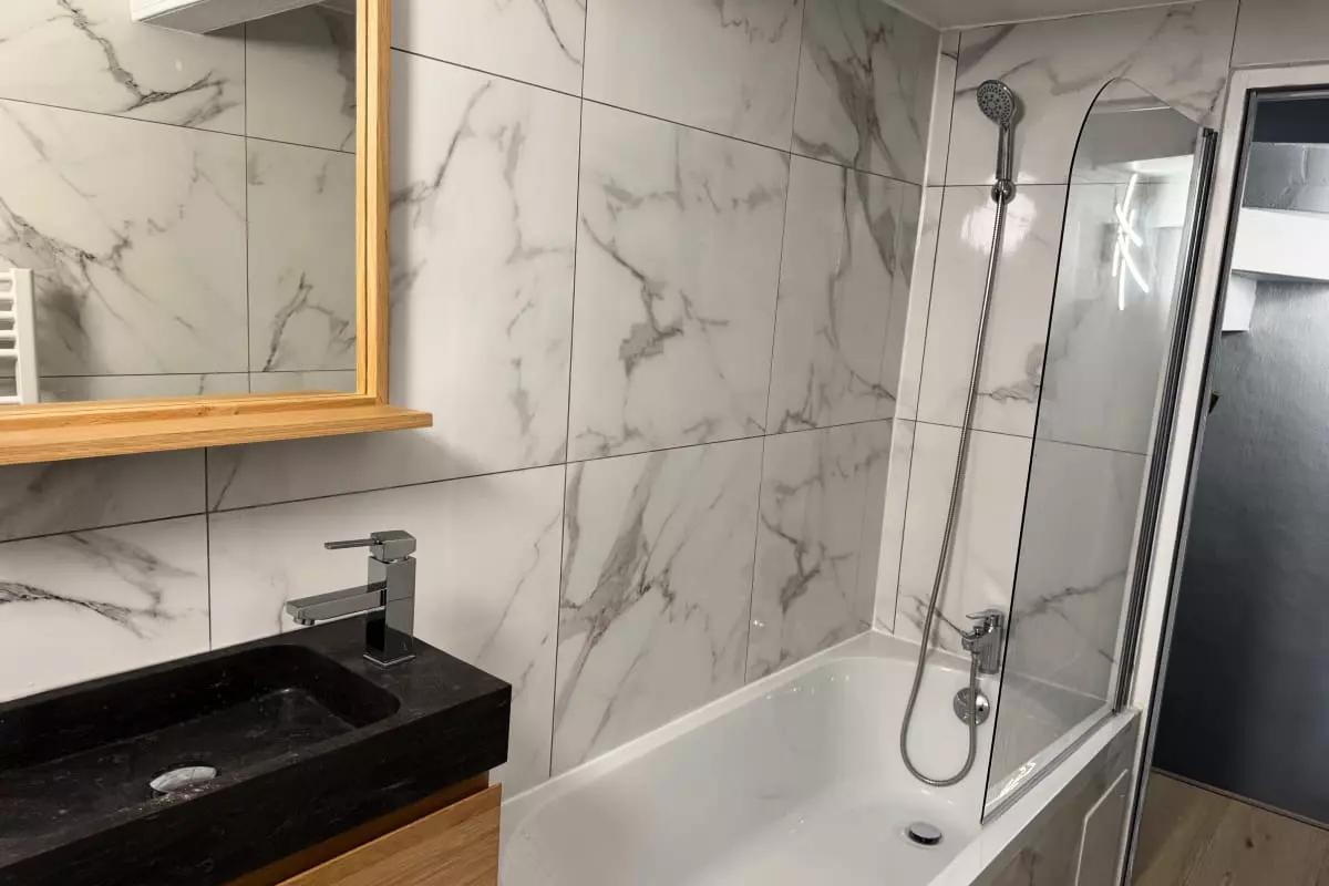 Vous pourrez profiter d’une grande salle de douche confortable avec WC attenant, ainsi qu’une salle d’eau à l’étage équipée d’une baignoire de 160 cm et d’un WC.